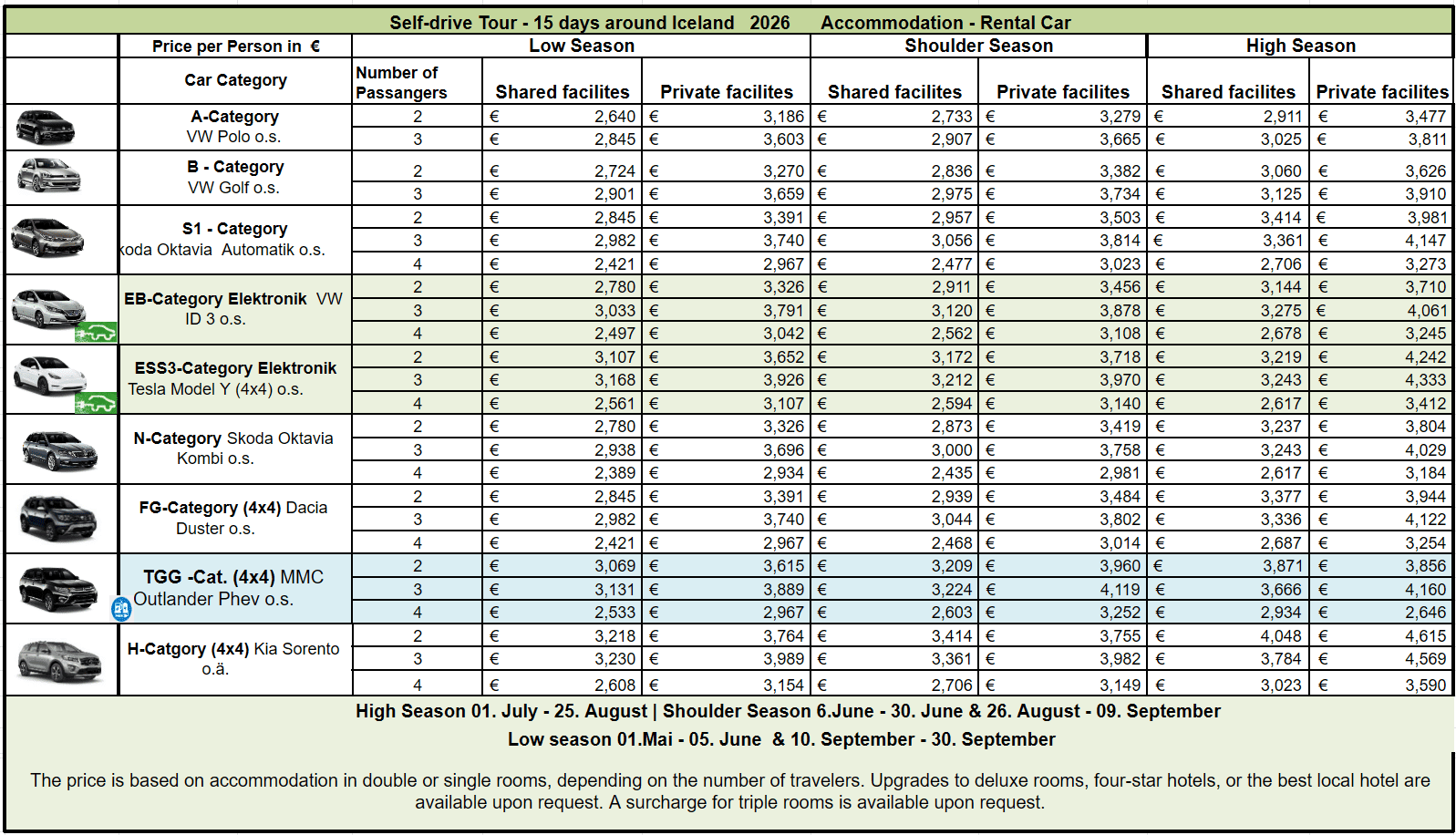 Fuel, meals other than breakfast, admissionto museums/exhibitions, GPS system and tunnel toll (Hvalfjörður). Extra driver € 45.