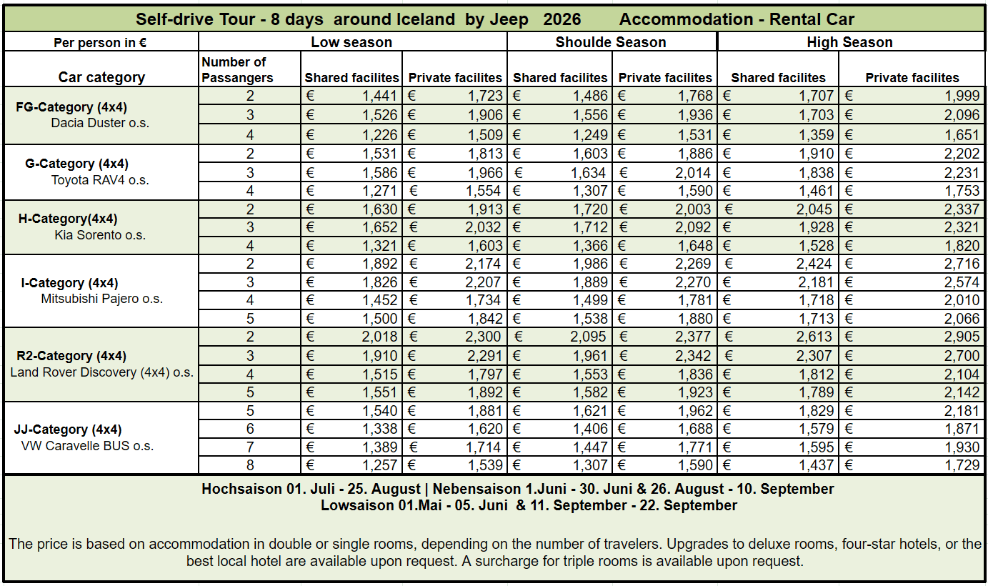 • 7 days rental car, incl. unlimited mileage, CDW, Icelandic VAT and pick-up/drop-off at the airport in Keflavík
