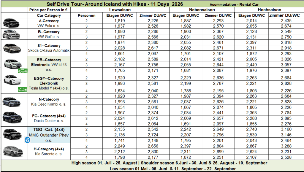 Fuel, meals other than breakfast, admission to museums/exhibitions, GPS system and tunnel toll (Hvalfjörður). Extra driver €45.