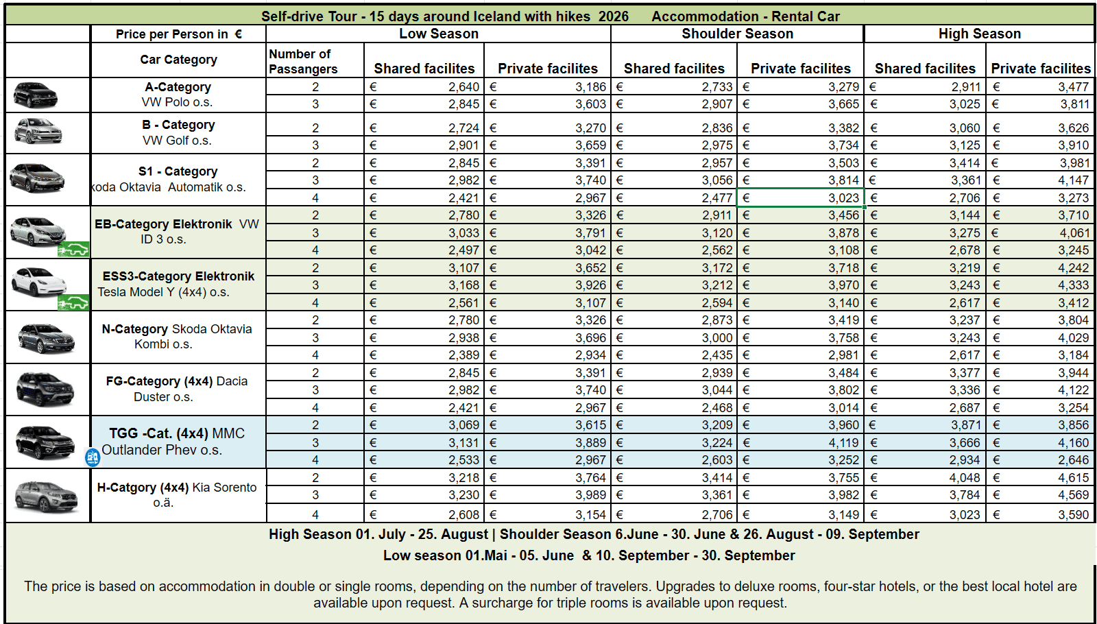 - 14 days rental car incl. unlimited mileage, CDW, Icelandic VAT and pick-up/drop-off at the airport in Keflavík